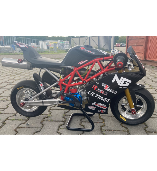 Kompletní závodní minibike. Osazen motorem NG, tlumičem řízení, ultra lehkými CNC koly, hliníkovími vidlice, hliníkovou vidlicí, odlehčenými kapotami, padacím rámem a protektory, tlumičem řízení, plovoucím brzdovým kotoučem 160mm, rychloupínáky kapotáže atd. Jedná se o speciální závodní stroj určený pro závody minimoto na nejvyšší úrovni.